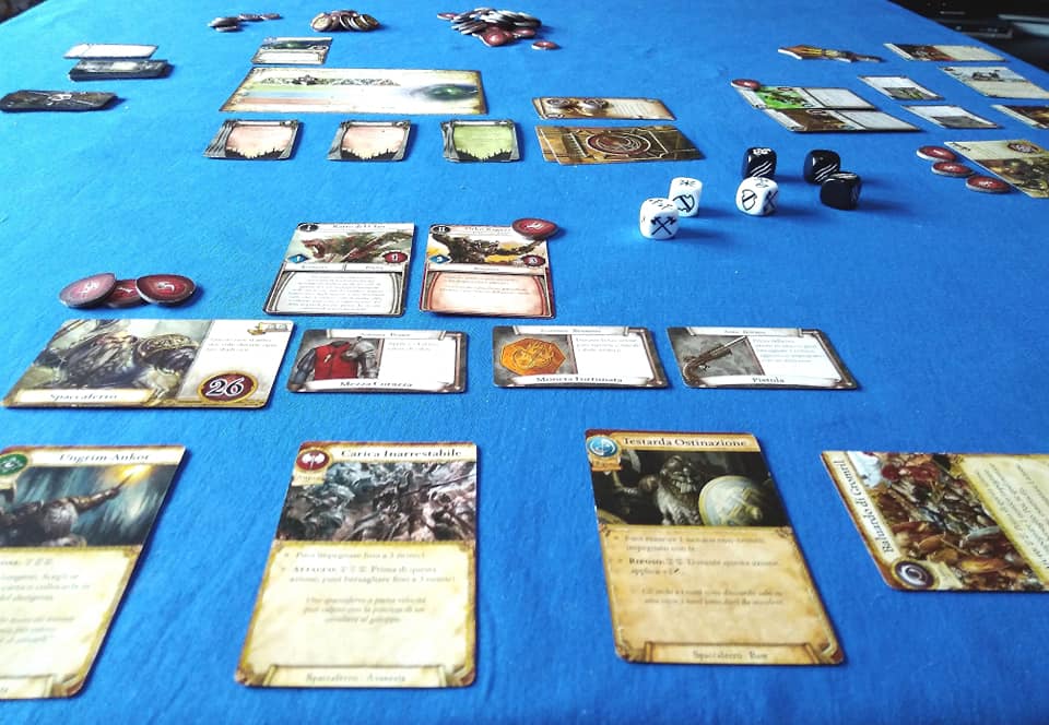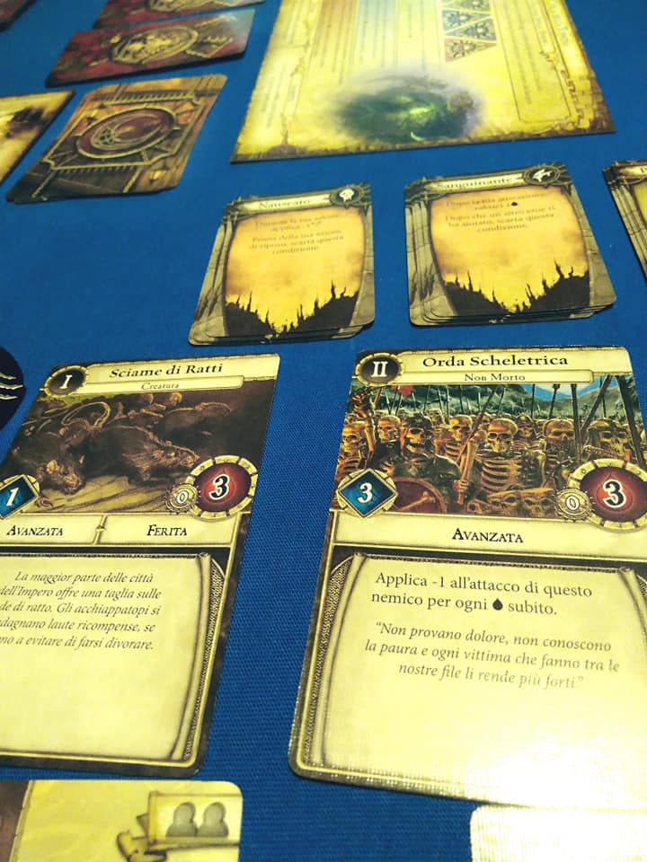 Ogni buon dungeon crawler (gioco in cui pochi avventurieri esplorano un dungeon cercando di uscirne vivi e arraffando il più possibile) ha un incipit di questo tipo. Warhammer Quest “the adventure card game” pur essendo un gioco di carte e dadi privo di mappe e miniature vuole portarci proprio in una atmosfera di questo tipo riproducendo “in piccolo” e con regole semplificate l’esplorazione e la conquista di una caverna infestata da numerose creature in tipico stile fantasy. Ogni incursione è gestita da un’apposita plancia che riporta la preparazione del set (carte stanza, nemici, carte esplorazione, tesori, boss del dungeon…) che sarà anche il display che gestirà i nostri progressi. Ogni round di gioco è composto da una fase di azione degli eroi, una fase di azione dei nemici e una di gestione dungeon. I nemici sono gestiti automaticamente (in modo ottimo) dalle carte stesse. La progressione da una stanza all’altra avviene ad esplorazione completata (sempre che i nemici ci permettano di girare indisturbati). La collaborazione col resto del party è fondamentale e con essa la scelta delle mosse da fare (che comunque avranno più o meno successo in base al tiro dei dadi nostri e dei nemici). Queste azioni sono fondamentalmente 4 e da un’incursione all’altra possono essere potenziate grazie alla gestione della modalità campagna che permette di far progredire la “storia” e l’abilità del nostro party.